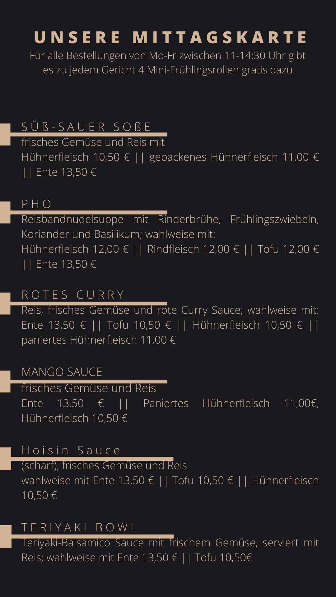 Mitten im Herzen der Erlanger Innenstadt servieren wir Dir im Huong Viet authentische vietnamesische Speisen. Wir sind ein kleiner Familienbetrieb, der bereits jahrelange Erfahrungen in der Gastronomiebranche in Franken gesammelt hat. Unsere Wurzeln haben wir dabei nicht vergessen und wollen Dir daher im Huong Viet unsere kulinarischen Spezialitäten aus Vietnam näherbringen. Genieß unsere traditionellen Speisen, die modern und kreativ neu interpretiert wurden und dennoch authentisch sind. Probiere auch unsere hausgemachten Erfrischungslimonaden. Qualität und Geschmack stehen bei Uns an oberster Stelle – Überzeug Dich selbst davon! Wir freuen uns auf Deinen Besuch im Huong Viet!